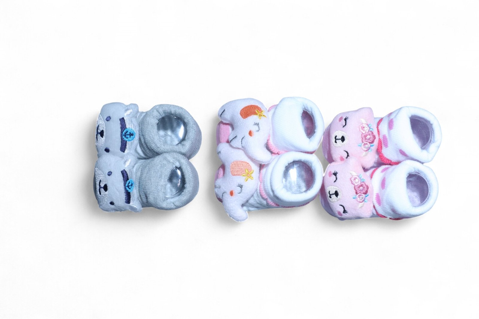 Stretch‑knit anti‑skid baby booties with rubber dot soles and cute animal motifs—secure, comfy, and adorable. Cushioned, low‑cut design with elastic ankle for secure fit and rubberized dot soles to prevent slipping. Gentle on delicate feet and easy to pull on for newborns and infants.