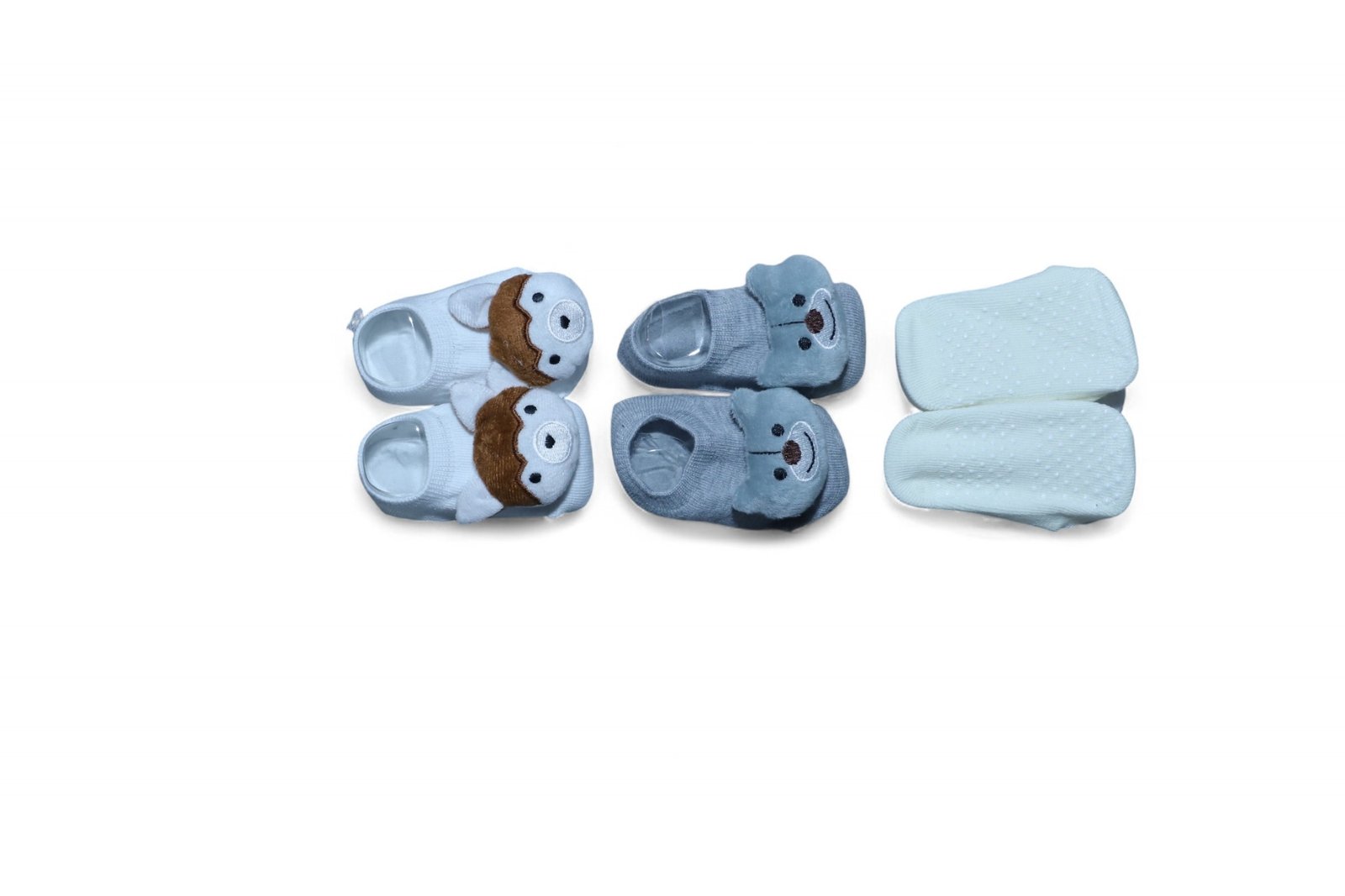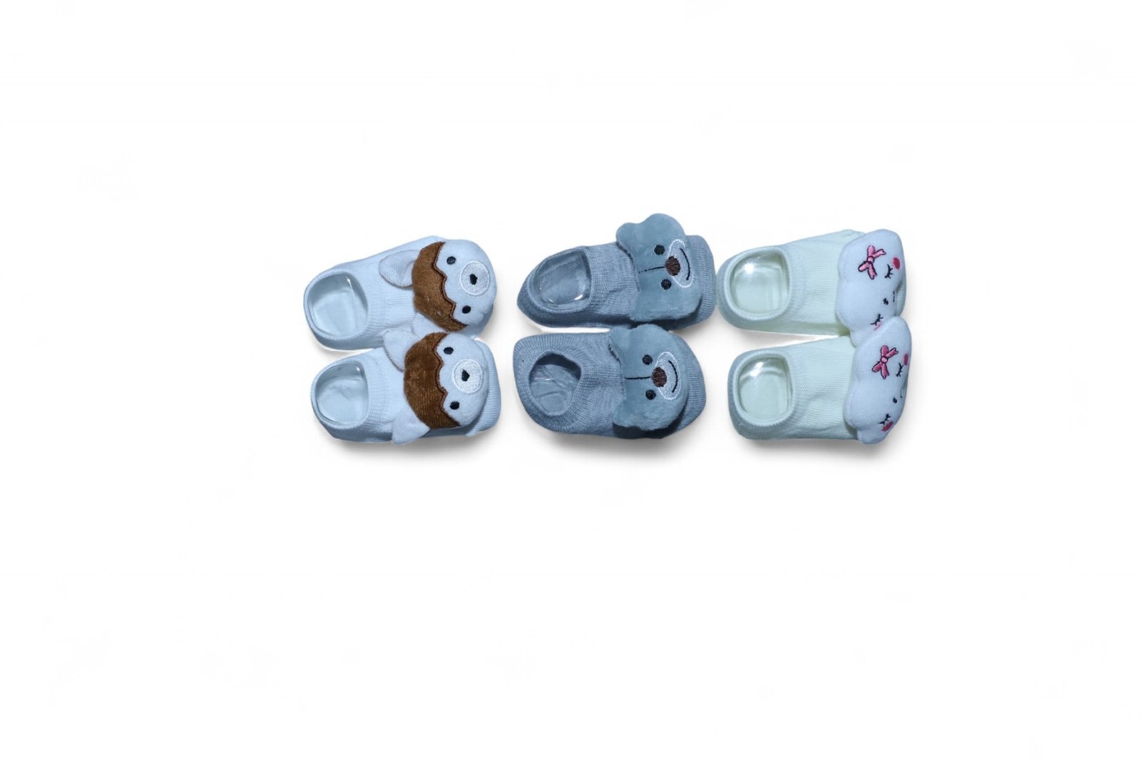 Soft, stretch-knit anti‑skid baby booties in assorted colorways and cute animal motifs (bunny, bear, cow, striped grips). Cushioned, low‑cut design with elastic ankle for secure fit and rubberized dot soles to prevent slipping. Gentle on delicate feet and easy to pull on for newborns and infants.