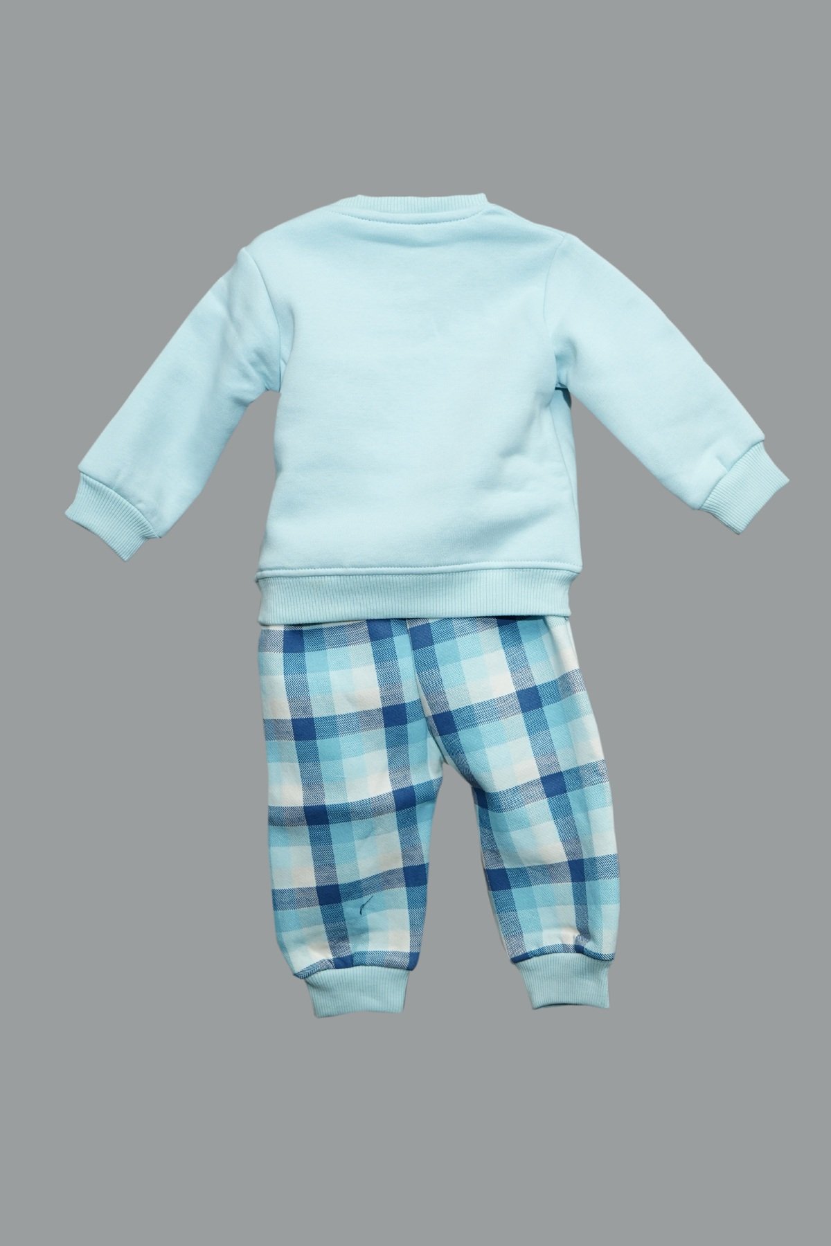 Snuggle up in the Baby Blue Bear Plaid Cozy Two‑Piece Set. This soft sweatshirt and matching plaid joggers feature a sweet bear-and-star applique on the chest, ribbed crewneck with shoulder snaps for easy dressing, and elastic-waist plaid pants with ribbed cuffs. Breathable, brushed knit offers gentle warmth without bulk—perfect for naps, playtime, and everyday comfort.