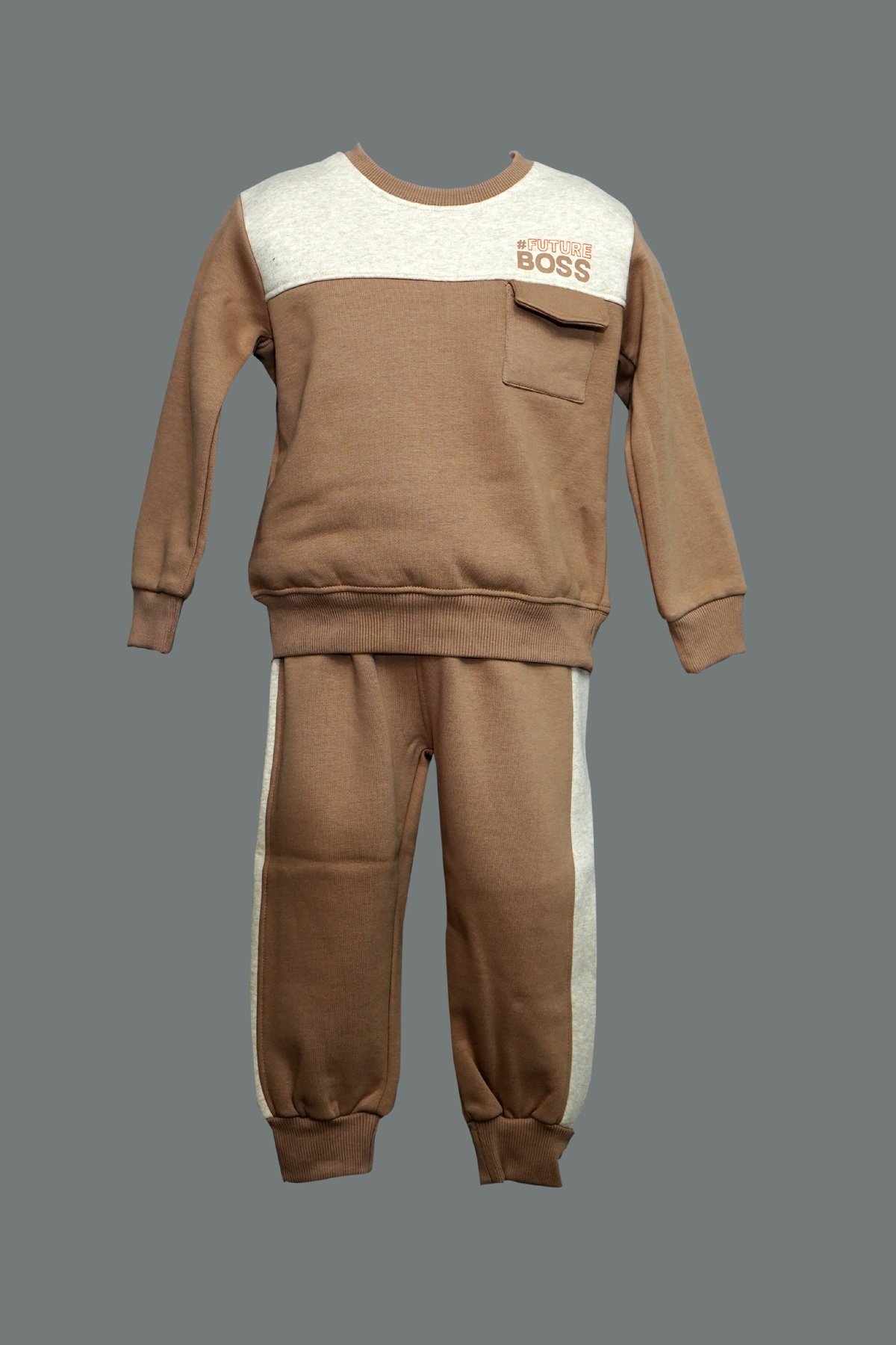The sweatshirt features a beige chest panel with the bold “Future Boss” print, plus a handy pocket for a playful touch. Coordinating pants with beige side stripes complete the look, making it perfect for casual outings, playtime, or lounging at home.