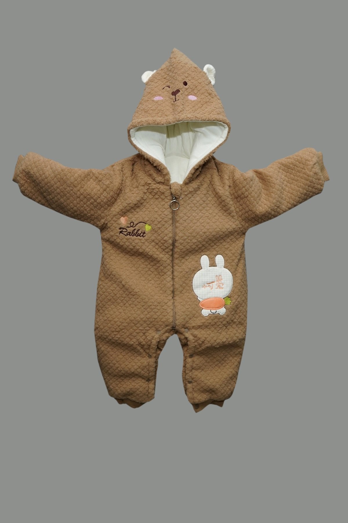 Decorative rabbit applique and carrot motif add playful charm while built-in cuffs at wrists and ankles lock in warmth. Plush lining provides cozy insulation without bulk—perfect for chilly outings and naptime.