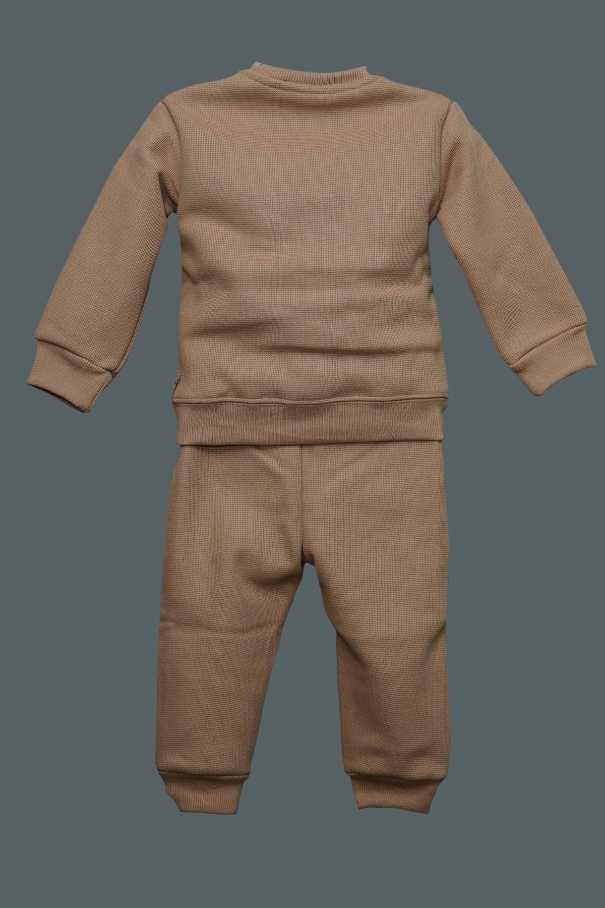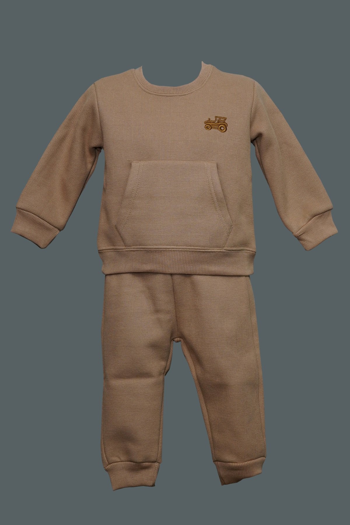 Keep your little one cozy and stylish with our Camel Waffle-Knit Toddler Set. This two-piece outfit includes a warm sweatshirt and matching jogger pants, both crafted from soft, medium-weight thermal fabric for all-day comfort. The crew-neck sweatshirt features a front kangaroo pocket and a small embroidered tractor on the chest, while the joggers offer a snug fit with elastic cuffs and waistband. Perfect for playtime or relaxed days at home.