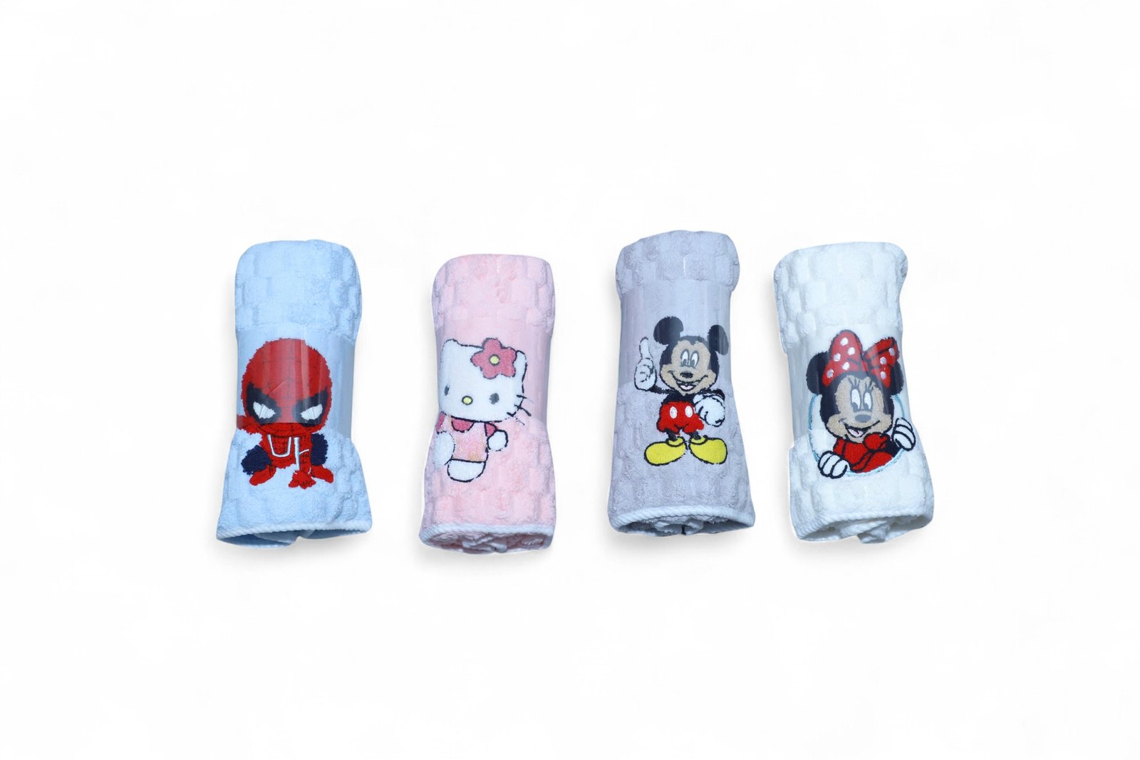 Soft, rolled plush baby towels with embroidered character motifs. Each towel features a textured waffle‑style pile, cute appliqué embroidery on the face area, and a sewn roll presentation for easy shelving or gifting. Lightweight, absorbent, and gentle on delicate skin—perfect for bath time, stroller cover, or nursery décor.