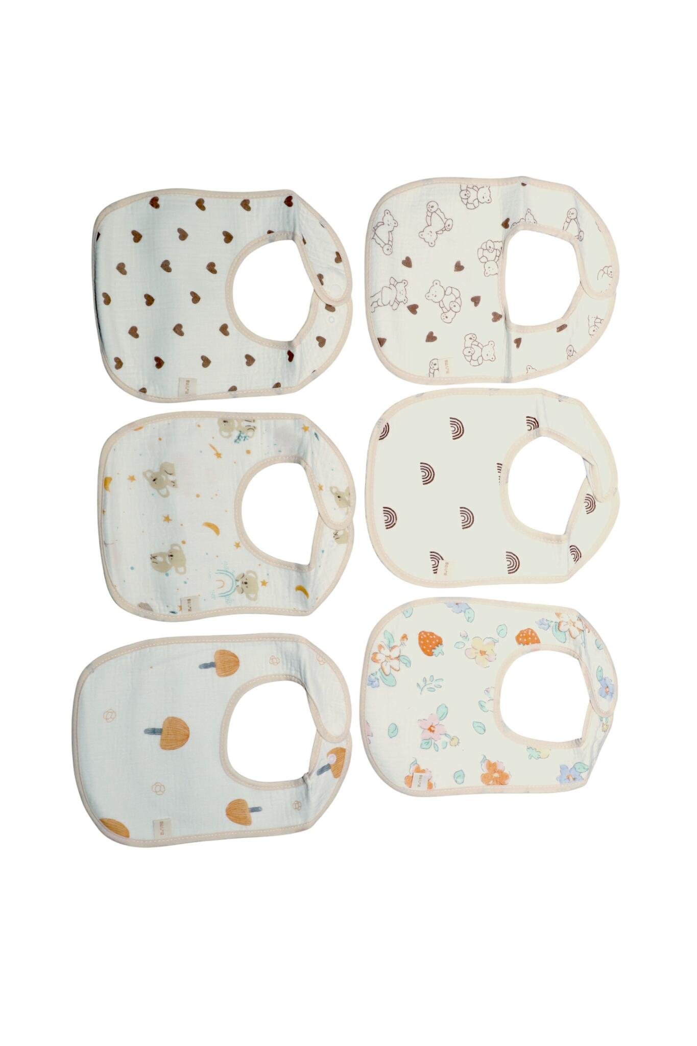 A versatile baby bib collection in soft pastels and playful prints — pastel blue, pink, mint, lavender, cream, and beige. Includes shaped tie‑back bibs, snap/Velcro bibs, ruffle‑trim and U‑shaped styles, plus printed designs: hearts, rainbows, florals, strawberries, mushrooms, bears, koalas, and polka dots. Quilted and muslin textures with absorbent layers make these ideal for feeding, drool, and everyday wear.