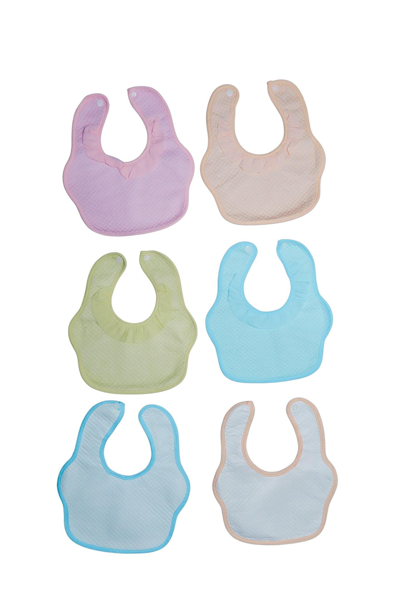 Assorted pastel bib set with tie, snap, and Velcro styles in charming prints — absorbent, soft, and easy to care for. Quilted and muslin textures with absorbent layers make these ideal for feeding, drool, and everyday wear.