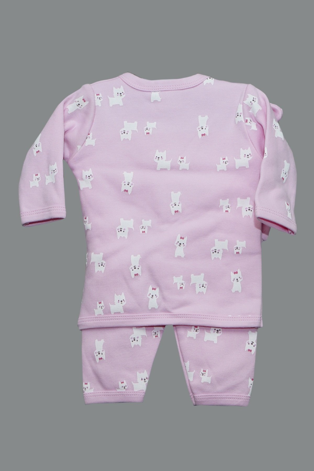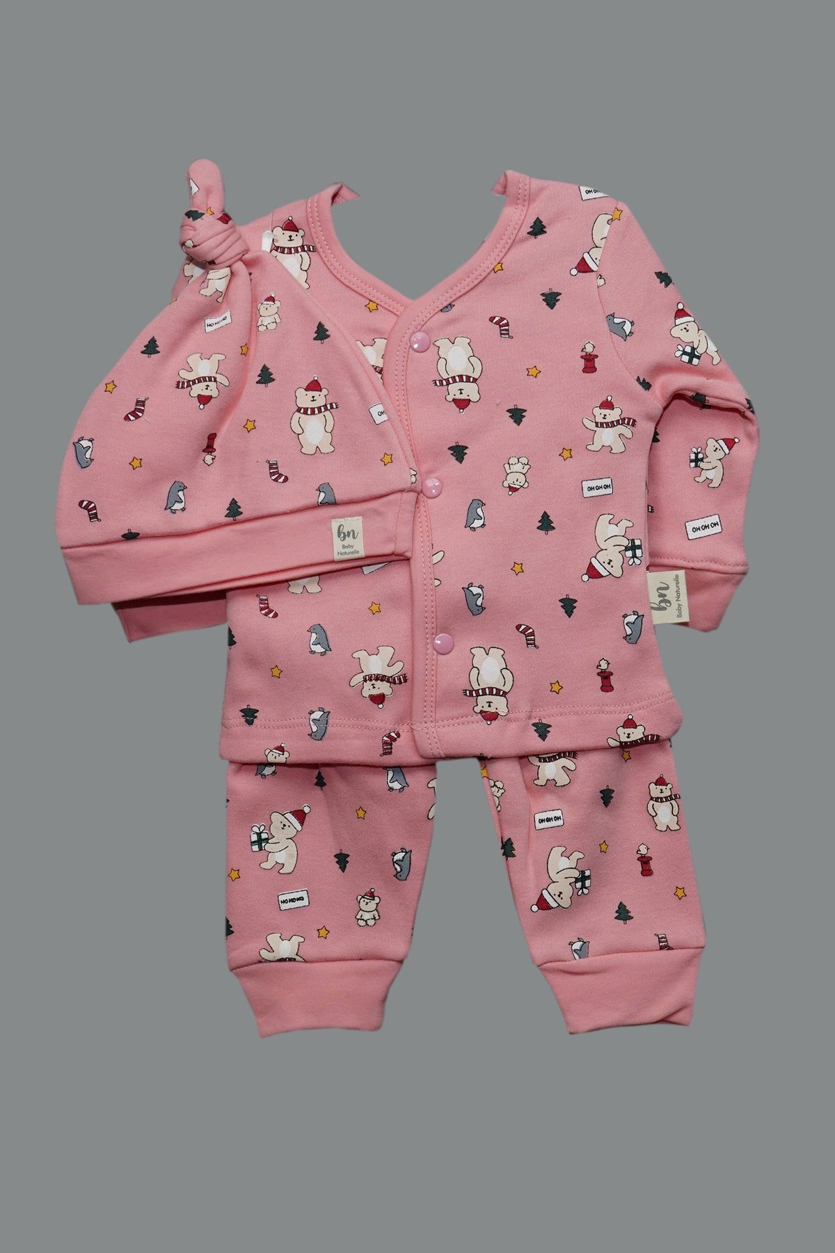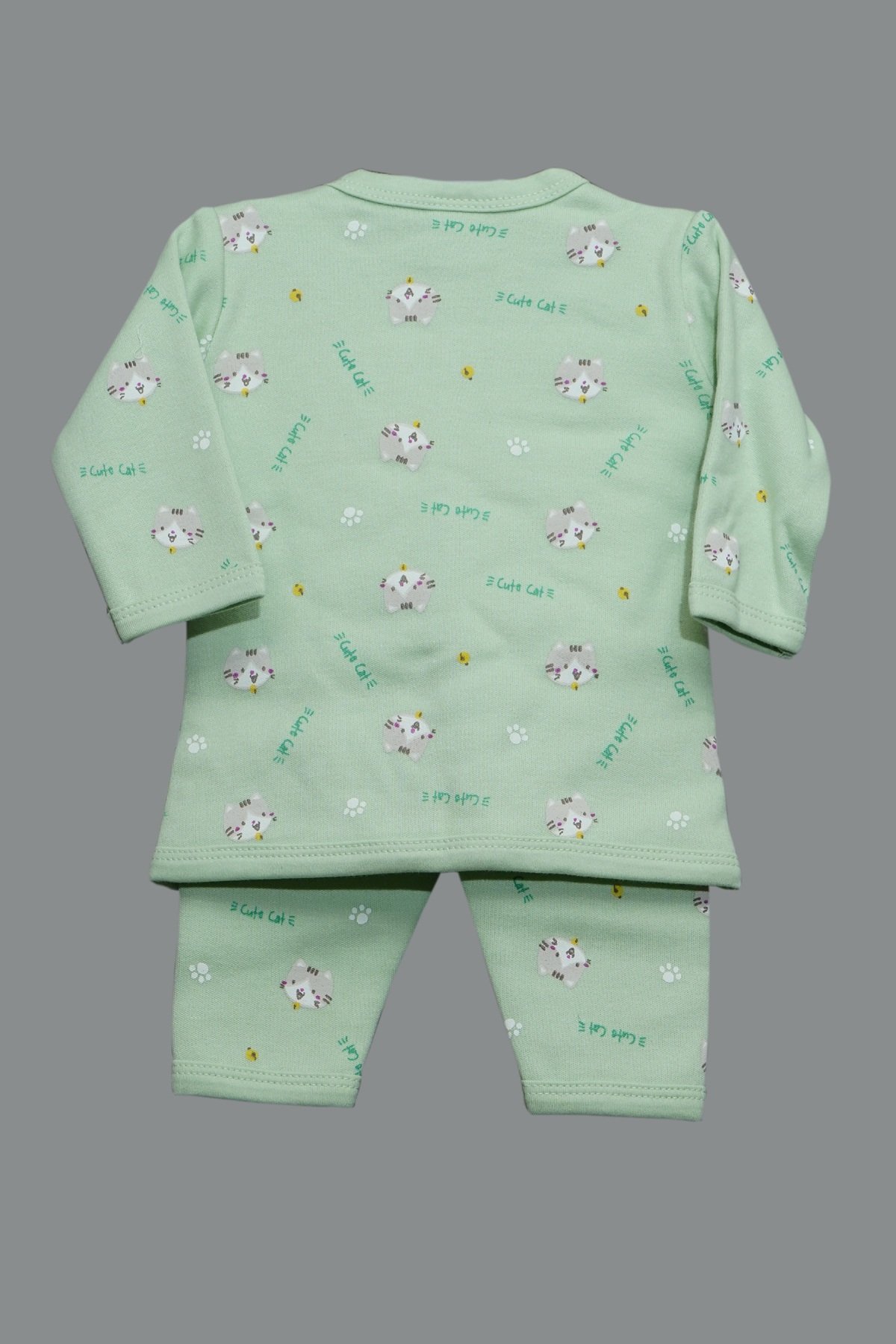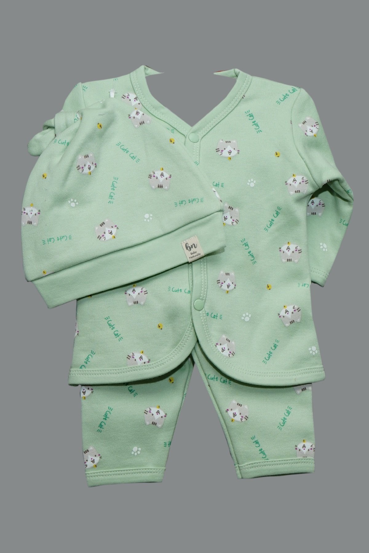 Sweet and practical, this Cute Cat Wrap‑Front Two‑Piece Set includes a soft knot hat and a wrap‑style top with snap closure, paired with matching mint leggings—all printed with tiny, smiling kitten motifs and scattered paw accents. Crafted from breathable, gentle cotton knit with ribbed hems for a secure fit, it’s perfect for newborn comfort and easy dressing.