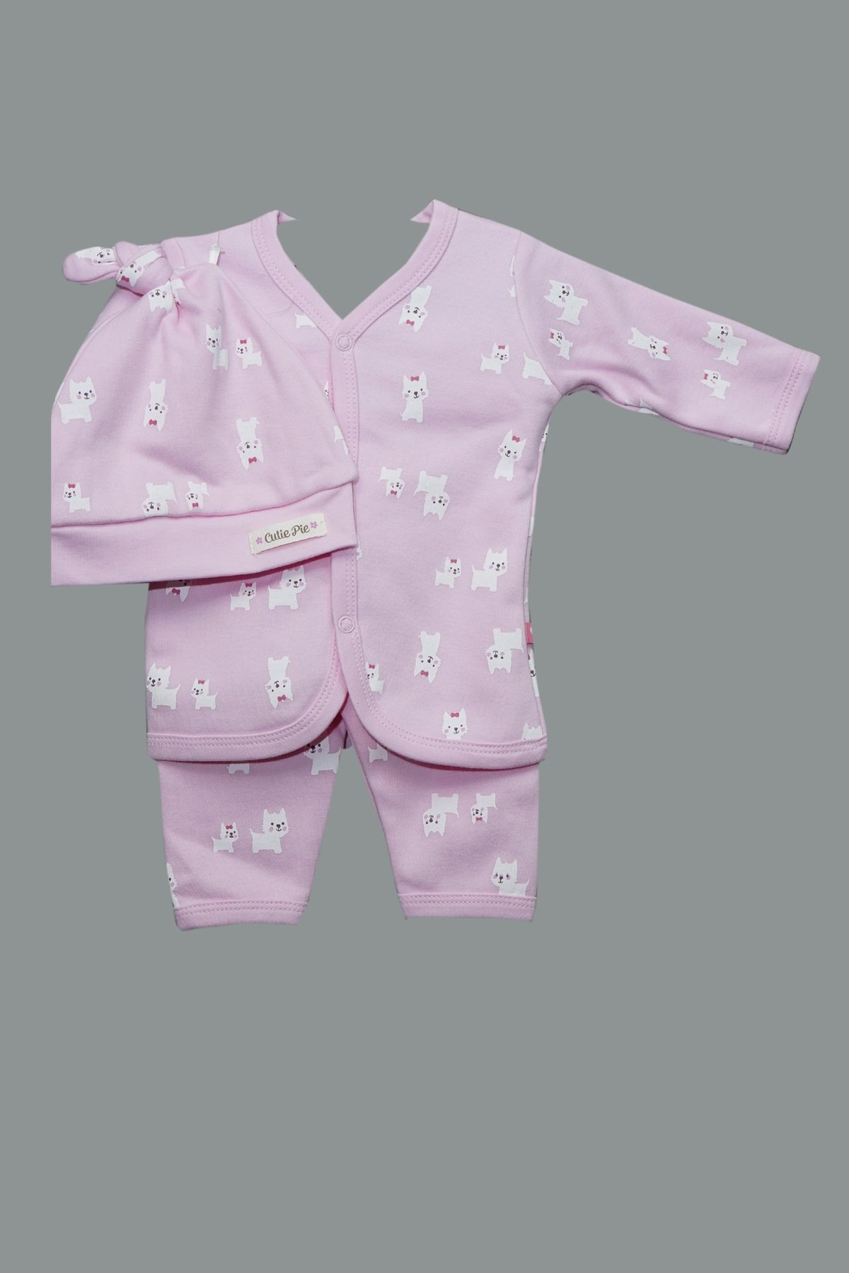 Cute Cat Wrap‑Front Two‑Piece Set (Hat + Leggings) wrap‑front baby set with knot hat and kitten‑print leggings—cute, comfy, and easy to dress.