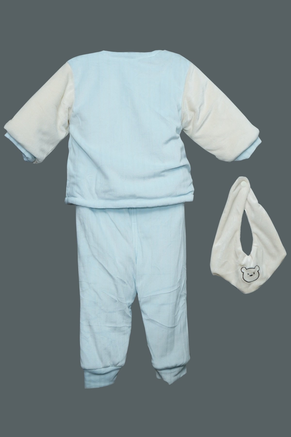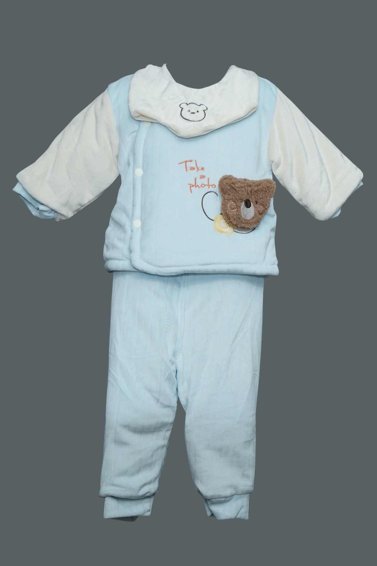 Keep your little one cozy and cute with our Light Blue Plush Baby Bear Outfit Set. Made from soft, plush fabric, this two-piece set includes a long-sleeve jacket-style top and matching pants. The top features a charming felt teddy bear applique with “Take Photo” embroidery and a white collar accented by a tiny bear detail. Gentle on delicate skin, this outfit is perfect for playtime, lounging, or casual outings.