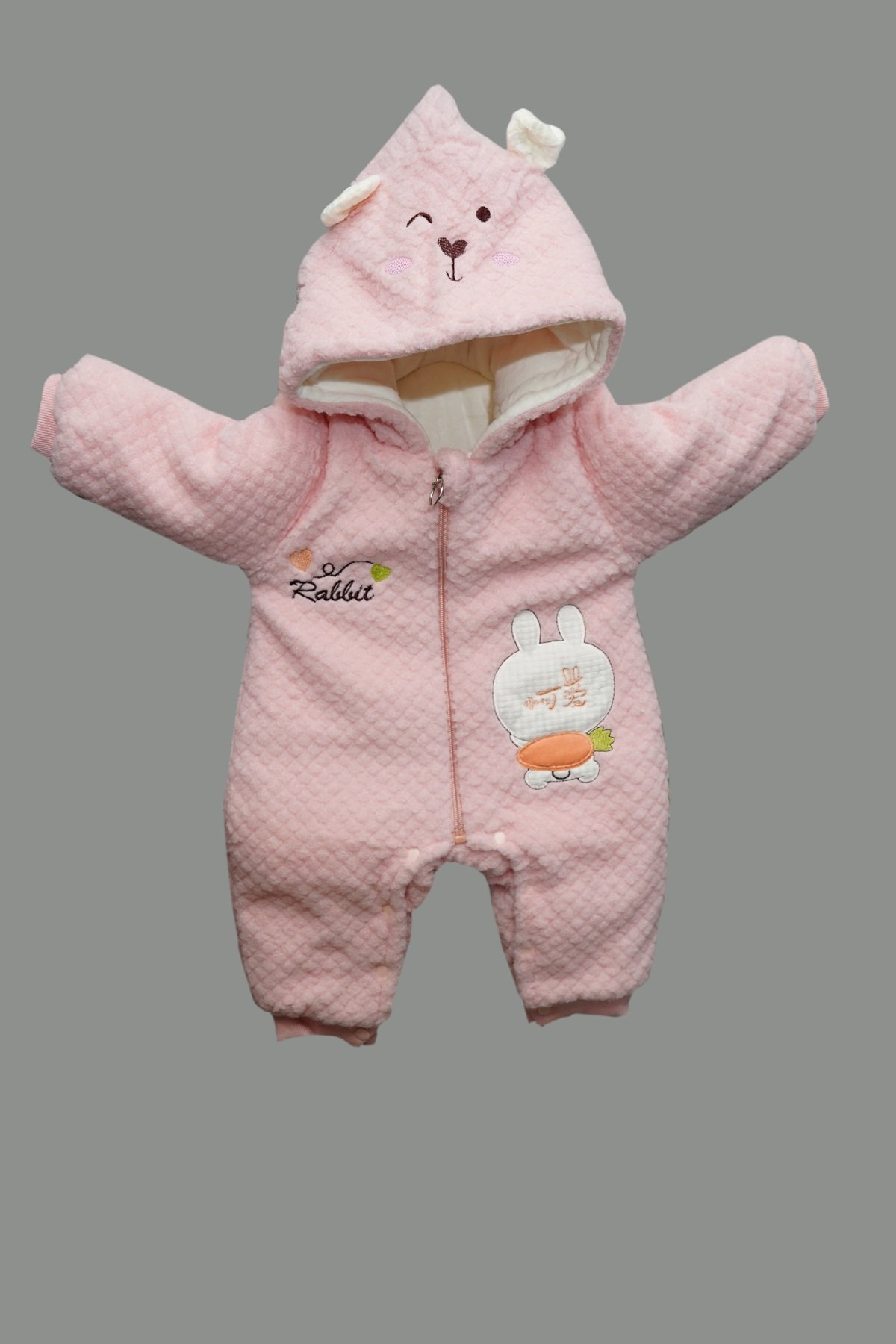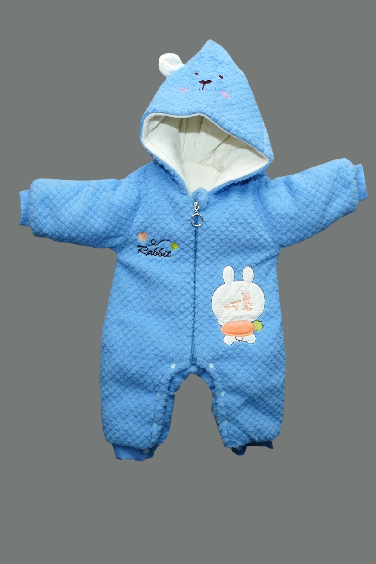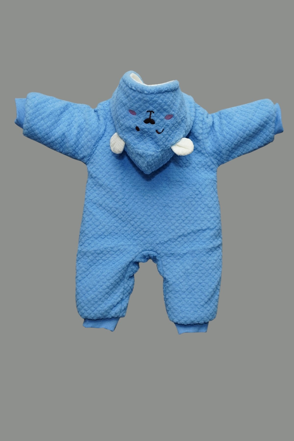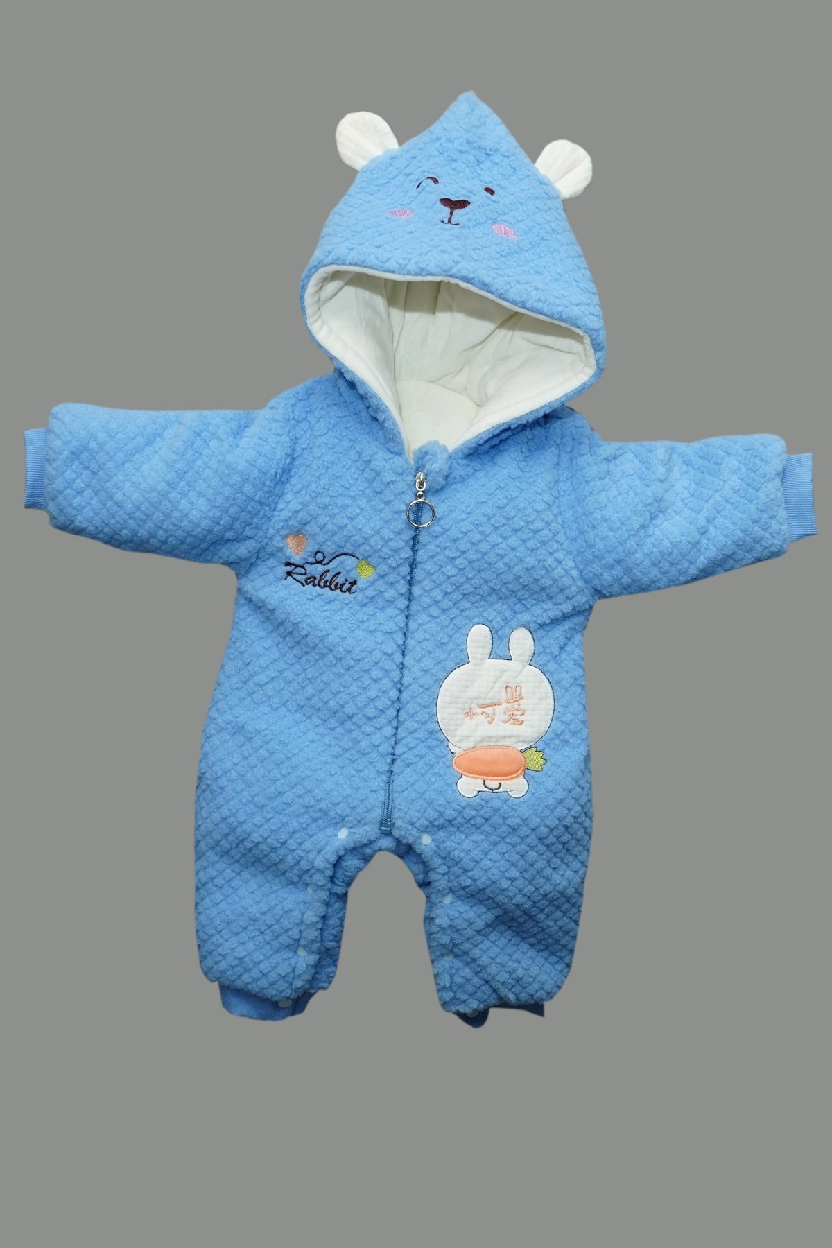 Keep your little one snug and adorable with our Light Blue Textured Baby Jumpsuit, crafted for warmth and everyday comfort. Made from soft quilted fabric, it features a playful bear-face hood and charming bunny applique with carrot embroidery. The full-length zipper makes dressing simple, while the cozy closed-bottom design keeps tiny feet warm. Perfect for nap time, playtime, or outdoor strolls, this jumpsuit combines practicality with cuteness.