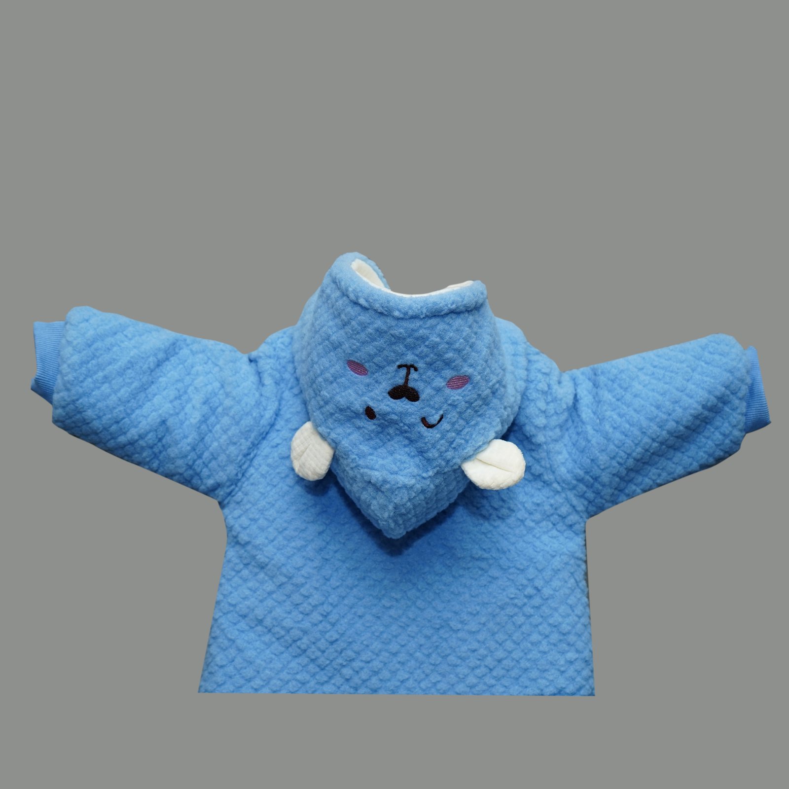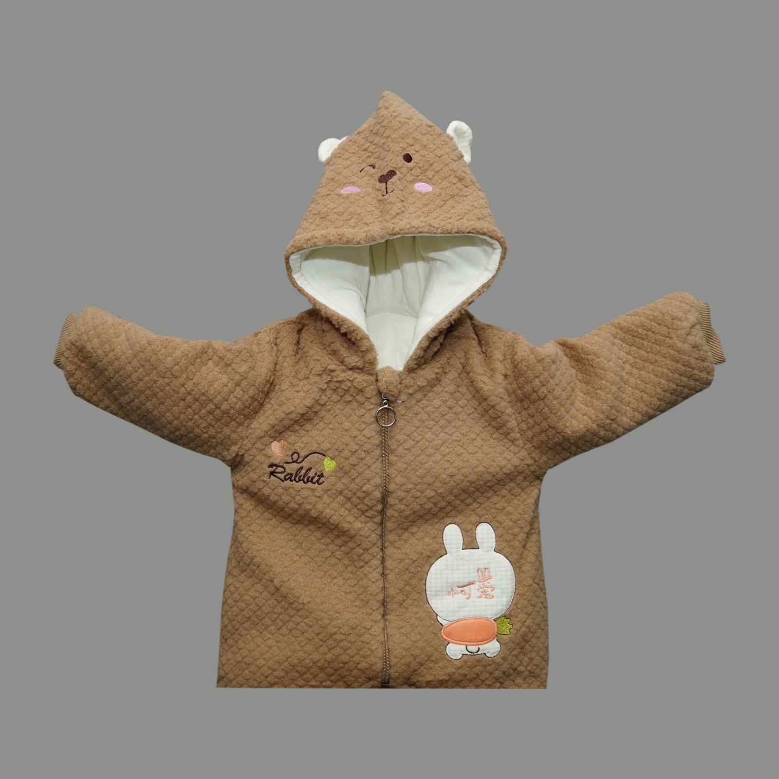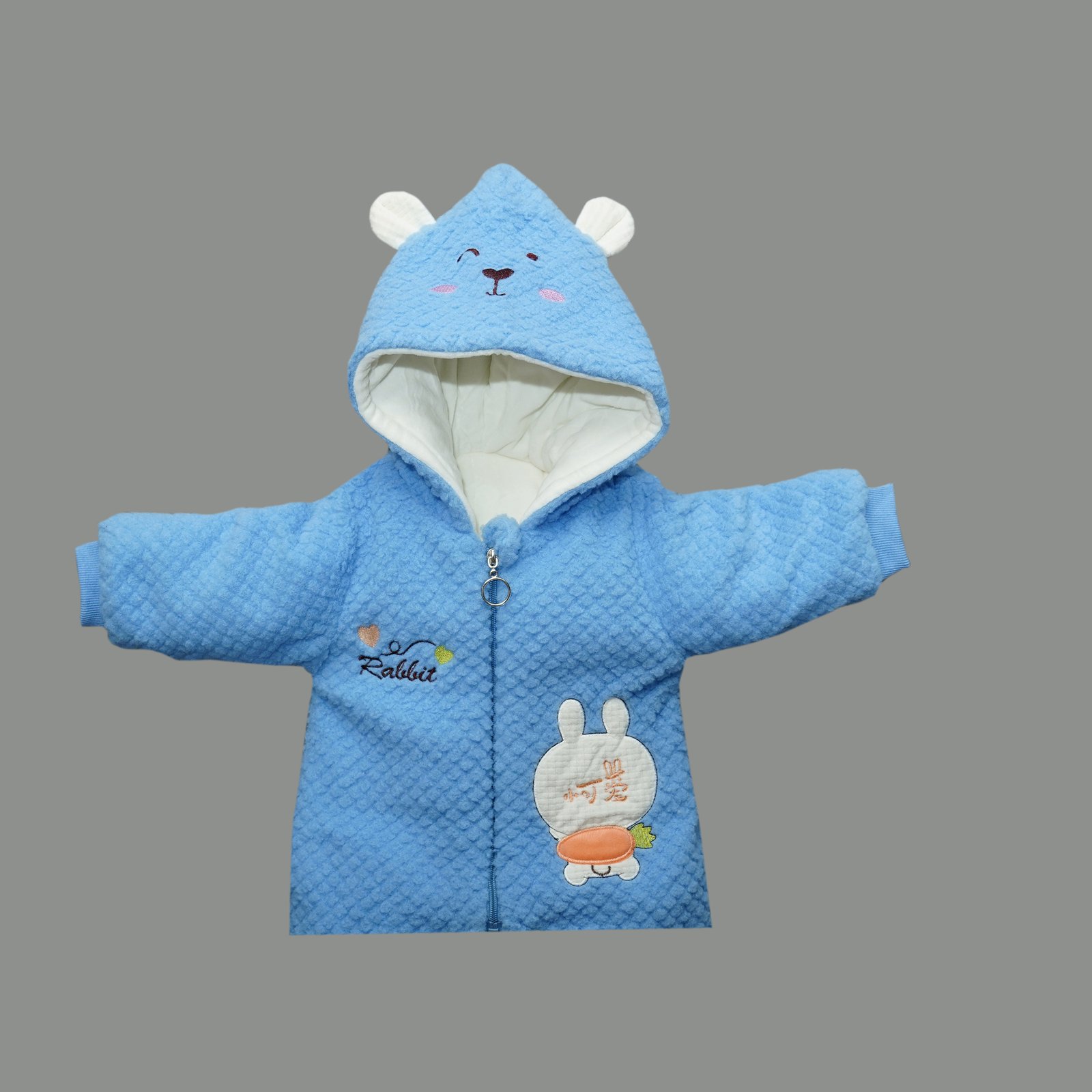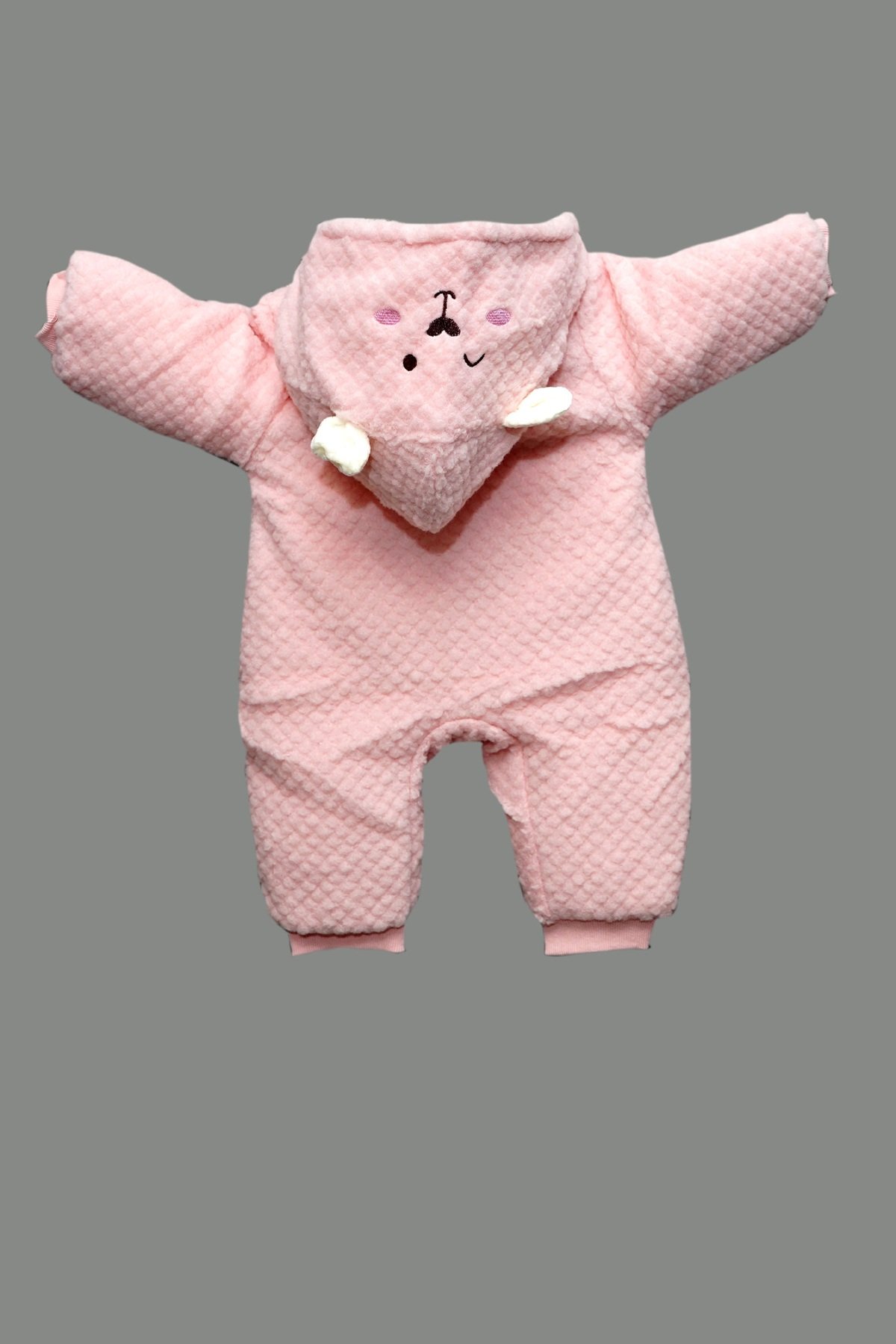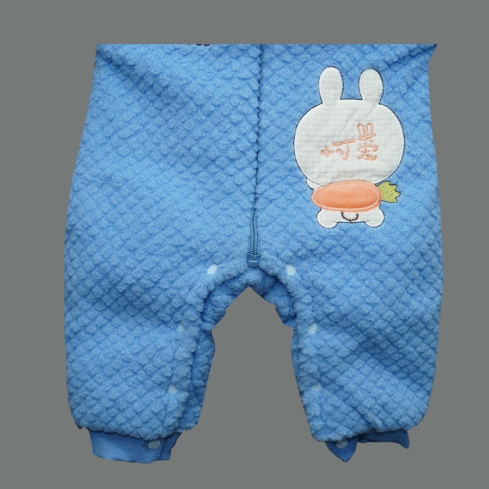 Keep your little one snug and adorable with our Light Blue Textured Baby Jumpsuit, crafted for warmth and everyday comfort. Made from soft quilted fabric, it features a playful bear-face hood and charming bunny applique with carrot embroidery. The full-length zipper makes dressing simple, while the cozy closed-bottom design keeps tiny feet warm. Perfect for nap time, playtime, or outdoor strolls, this jumpsuit combines practicality with cuteness.