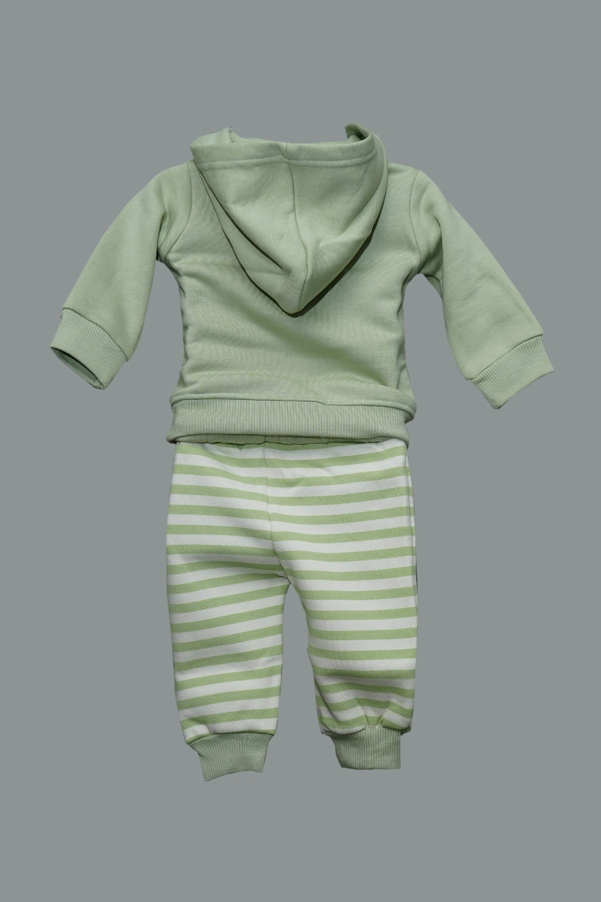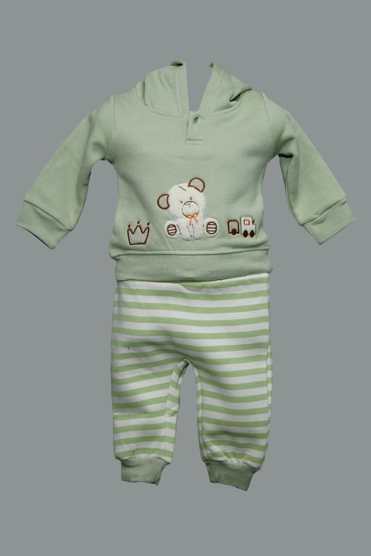 Sweet and cozy, this Mint Teddy Hoodie & Stripe Jogger Set includes a hooded pullover with a stitched teddy applique and coordinating green-and-white striped joggers. The hoodie features a soft ribbed hem and cuffs plus a small front button placket. Elastic-waist pants with ribbed ankle cuffs ensure a secure, comfy fit. Lightweight, breathable cotton knit keeps baby warm without overheating.