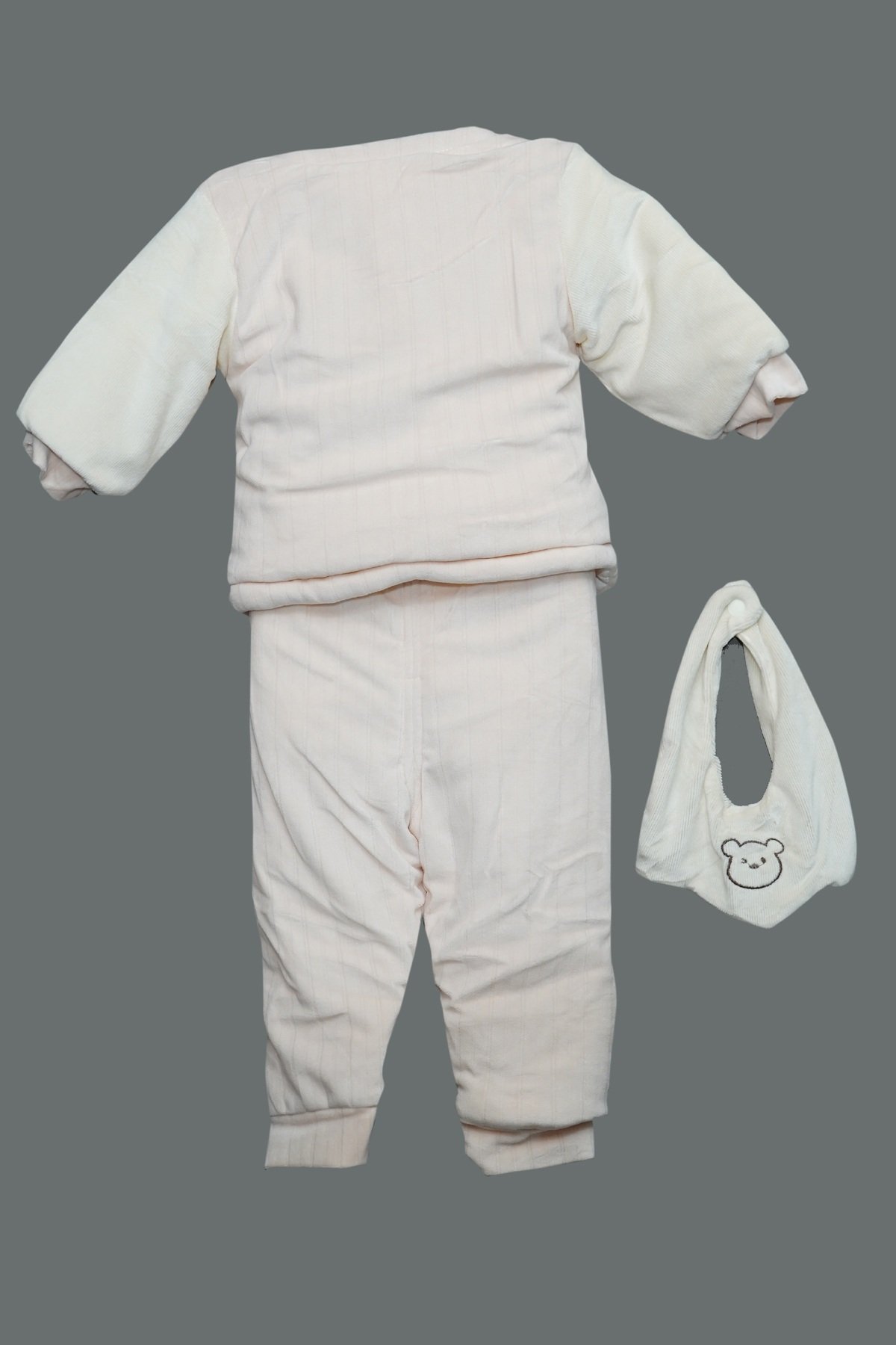 The jacket features a boxy fit with dropped shoulders, rolled hem, and turned cuffs for a relaxed look. The matching high-waist pants offer comfort with lightly gathered details and folded cuffs. The off-white bib with an embroidered smiling bear adds a playful finish. Perfect for cool days, indoor wear, or gifting.