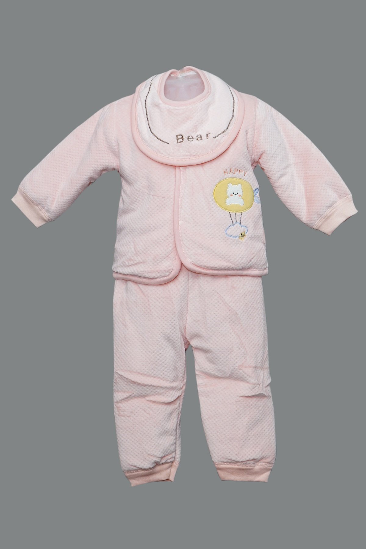 Wrap your baby in comfort with our Pastel Pink Quilted Baby Bear Set. This three-piece outfit includes a soft quilted jacket, matching pants, and a coordinating bib collar embroidered with “Bear.” The jacket features a smiling bear patch with “Happy” embroidery and a playful balloon design. Made from gentle quilted fabric, it keeps your baby warm and cozy while allowing easy movement. Perfect for daily wear or as a thoughtful gift.
