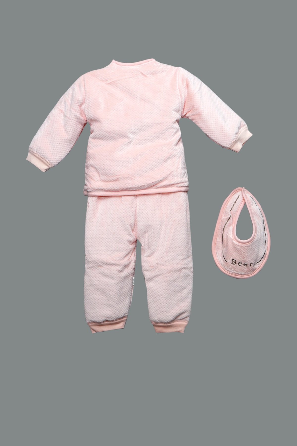 Pastel Pink Quilted Baby Bear Set – Jacket, Pants & Bib