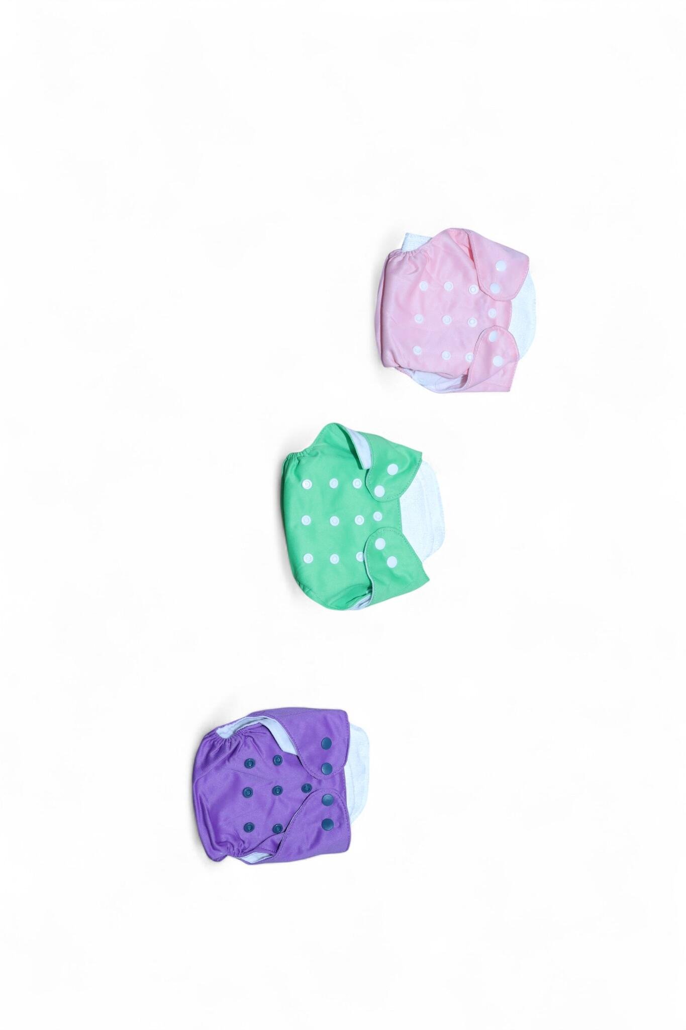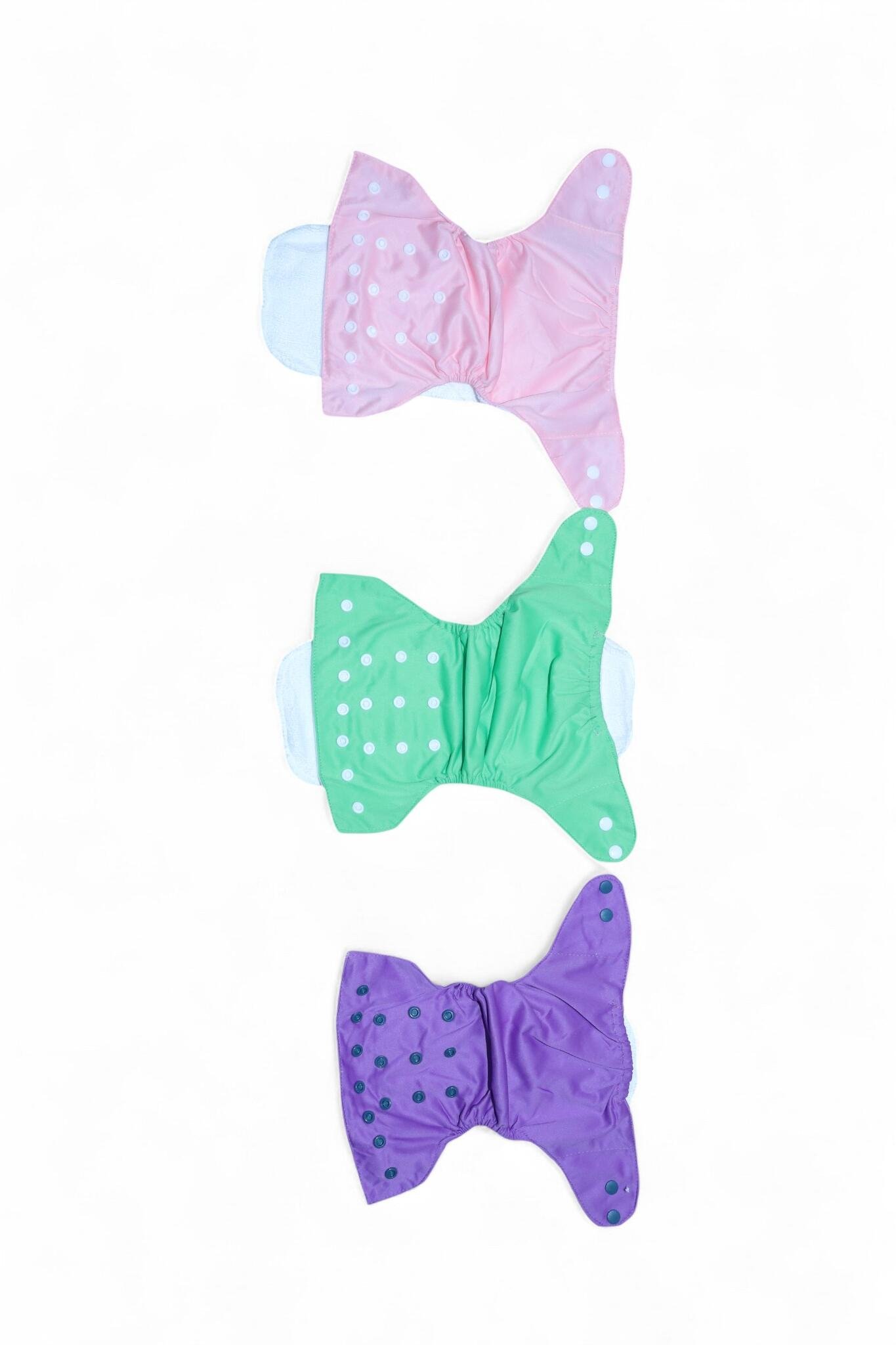 Practical, eco‑friendly cloth diapers with waterproof outer shell and removable absorbent insert. Each diaper features adjustable snap closures and elasticized leg/gusset for leak protection, plus a soft inner lining for comfort. Inserts are absorbent, quick‑drying, and easy to remove for washing. Available in solid pink, green, and purple colorways.