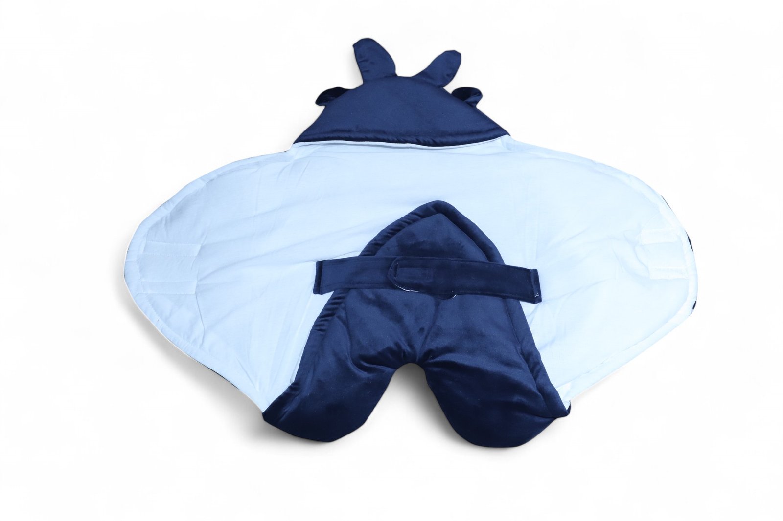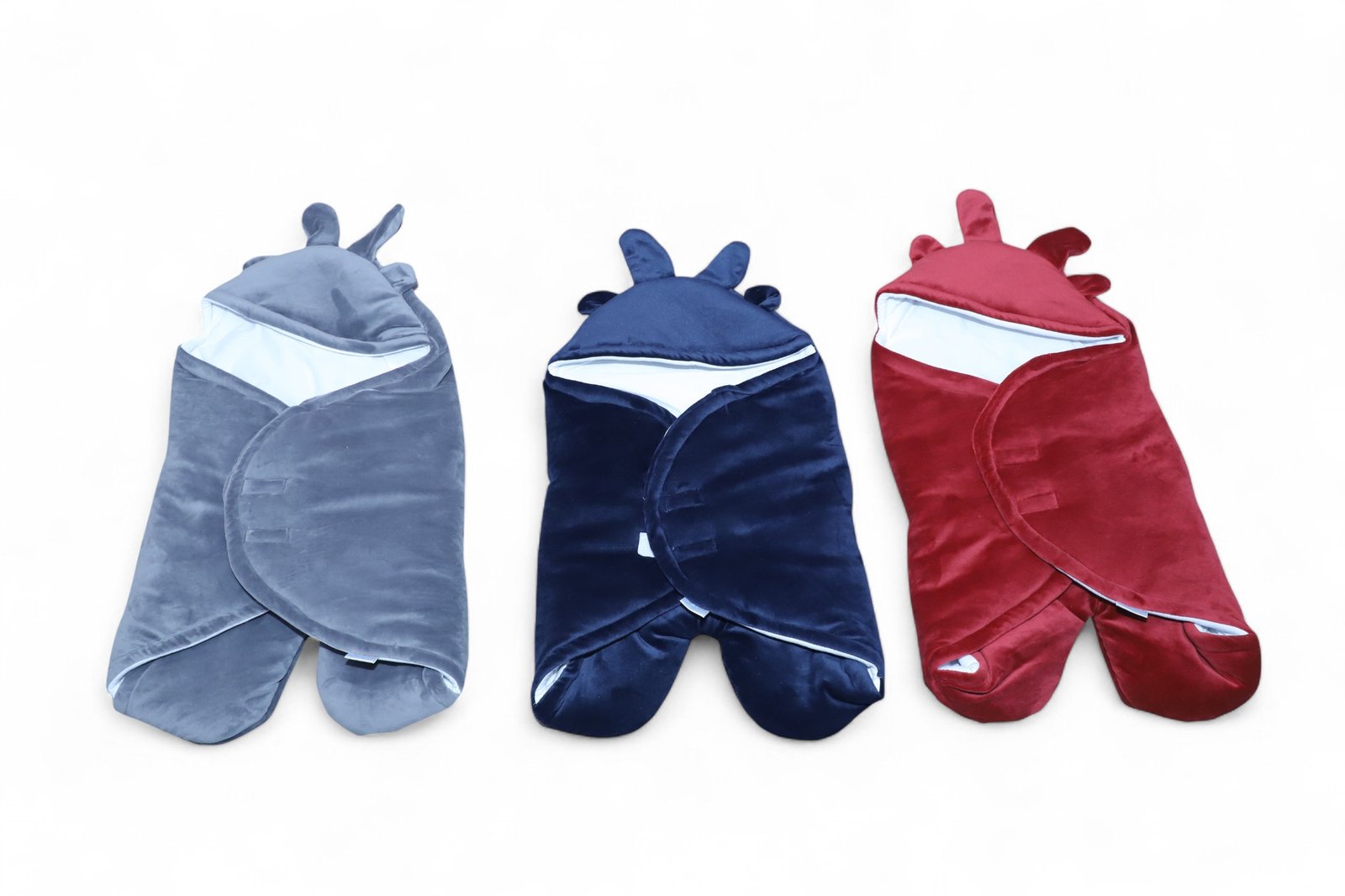 Padded hooded nest wrap with zip + Velcro placket—cozy, secure, and travel‑ready. Color options: grey, navy (blue), burgundy (red)