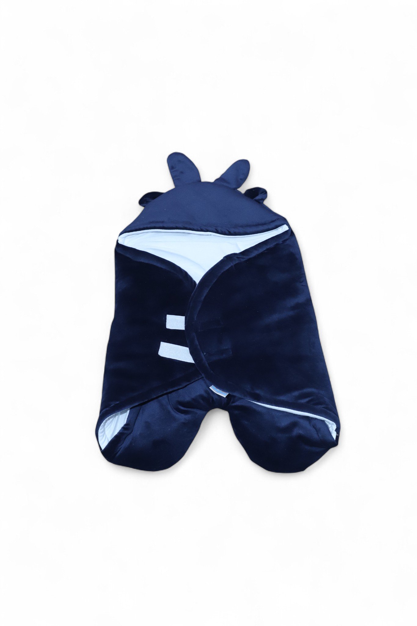 A padded Velcro Nest Wrap designed for snug outings and stroller naps. Features a plush-lined hood, full-length front zip with overlapping Velcro placket, built-in foot section, and side openings for easy diaper access. Soft velvet-like exterior with smooth, breathable inner lining and reinforced stitching for durability. Available in grey, navy, and burgundy with subtle ear/fin details on the hood.